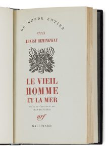 HEMINWGAY (Ernest) — Le Vieil homme et la Mer. — Paris, Gallimard, Nrf, 1952. — In-12 (18,5 x 11,6 cm), peau d’autruche noire, au premier plat coin inférieur mosaïqué en box bleu ciel avec, à cheval, le titre de l’ouvrage poussé au...