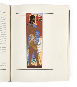 ORNÉE DE 98 ILLUSTRATIONS EN COULEURS DE F.-L. SCHMIED, DONT UNE À DOUBLE PAGE, 73 À PLEINE PAGE, UNE CARTE SUR DOUBLE PAGE, GRAVÉES SUR BOIS PAR SON FILS THÉO SCHMIED ET COLORIÉES AU POCHOIR PAR JEAN SAUDÉ. L’ILLUSTRATION COMPREND ÉGALEMENT 2 TÊTES DE CHAPITRES DÉCORATIVES, NON COMPRISES DANS LES 98 ANNONCÉES, ET UN MÉDAILLON.