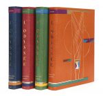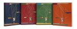 géométrique poussé à froid à l’or et au palladium, mosaïqué de maroquin de diverses couleurs suivant les volumes, dos lisses ornés en long du titre en lettres mosaïquées de différentes couleurs selon les volumes, couvertures et dos en peau de vélin conservés, chemise et étui (Alix).