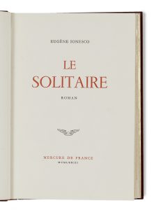 IONESCO (Eugène) — Le Solitaire, roman. — Paris, Mercure de France, 1973. — In-8 (21,3 x 13, 8 cm), box bordeaux, filet doré encadrant les plats, nom de l’auteur et titre de l’ouvrage dorés sur le dos orné d’une composition...