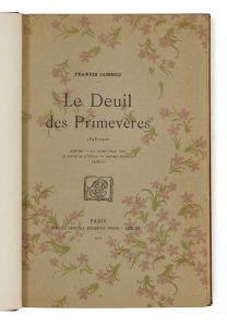 JAMMES (Francis) — Le Deuil des primevères. — Paris, Société du Mercure de France, 1901. — In-8 (25,2 x 16,1 cm), maroquin grenat, sur les plats, encadrement de 7 filets dorés, au centre des plats, alternance de motifs floraux aux pétales...