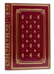 de maroquin rouge et de petites marguerites dorées, le tout dans un encadrement constitué de 4 filets dorés avec fleurons dorés aux angles, d’un listel de maroquin vert foncé et d’un filet doré, dos à nerfs orné des mêmes motifs floraux avec encadrements de filets dorés et listel de maroquin vert, doublures de maroquin vert avec encadrement de cinq filets dorés, gardes de soie parme, tranches dorées, doubles couvertures et dos conservés, chemise (Semet et Plumelle).