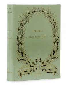 poussés à l’or et au palladium, dos lisse, tranches dorées, encadrement intérieur d’un filet doré, doublures et gardes de peau velours vert pomme, couvertures et dos conservés, chemise et étui (P.-L. Martin - 1957).