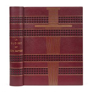 LARRETA (Enrique) — La Gloire de Don Ramire. — Paris, Bibliophiles de l’Amérique latine, 1934. — 3 parties en un fort vol. in-4 (32,3 x 24,5 cm), maroquin bordeaux, sur les plats vaste décor de bandes horizontales de pastilles à froid...