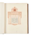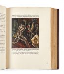 juxtaposées, courant sur le dos, prises entre deux filets dorés, sur le plat supérieur ce décor est interrompu partiellement par un glaive stylisé en filets dorés droits, horizontaux et en faisceau vertical, dos lisse avec titre doré, encadrement intérieur de même maroquin avec un filet à froid, chaque contreplat renfermant une peinture à l’huile de Daragnès, gardes de soie lie-de-vin, tranches dorées, couvertures conservées, chemise et étui (G. Cretté succ. de Marius Michel).