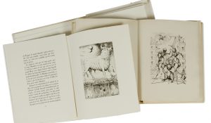 Il est enrichi d’une des 20 suites en blanc sur Canson noir (n° 3/12), du menu du dîner du Taureau blanc, illustré, sur papier du Japon et du tirage de l’eau-forte du menu en blanc sur papier Canson noir.