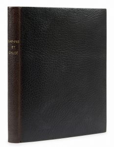 LONGUS — Les Pastorales de Longus ou Daphnis et Chloé. — Paris, chez l’artiste, 1928. — In-4 (33,5 24,9 cm), reliure janséniste maroquin vert lierre, dos lisse, titre doré, encadrement intérieur d’un filet au palladium, doublures de...