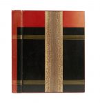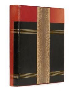 6 filets dorés parallèles en pied et vers la tête du plat, bande verticale prenant toute la hauteur du plat de peau de karung tannée au naturel, deux séries de 6 filets dorés parallèles horizontaux sur environ 5 cm, dos lisse orné des mêmes filets dorés, doublures de box écarlate, gardes de soie noire, tête dorée, couvertures et dos conservés (Semet & Plumelle – Tahon).