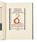 LOUŸS (Pierre) — Contes antiques. — Paris, Éditions du Bois Sacré, 1929. —Grand in-4 (32,5 x 24 cm), maroquin noir, composition géométrique de triangles de filets et pointillés dorés centrée autour de 2 triangles en vis-à-vis...