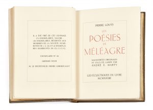 LOUŸS (Pierre) — Les poésies de Méléagre. — Paris, Les éclectiques du livre, 1933. —In-12 (16,2 x 12 cm), maroquin gris, décor d’alternance de doubles filets dorés en carrés et de trois points à froid en pied des plats et du dos,...
