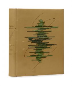 grand lacet fait d’une fine et profonde incision parcourant tout le plat, le tout agrémenté d’un semé de points dorés, dos lisse orné de 4 filets obliques à l’œser gris-bleu, tranches dorées, doublures et gardes de peau velours vert d’eau, couvertures et dos conservés, chemise et étui (Renaud Vernier 1988 – E. D. Claude Ribal).
