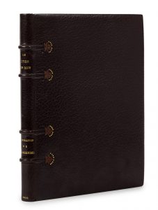 cerclées de petites étoiles poussées à l’or, dos à nerfs, tranches dorées, doublures de maroquin bleu nuit aux armes du duc de Massa dorées et mosaïquées de maroquin rouge, blanc et vert au centre, avec encadrement de maroquin turquoise orné de filets dorés, gardes de soie moirée bleu nuit, couvertures et dos conservés, chemise et étui (P. Affolter - J. Augoyat-Sr.).