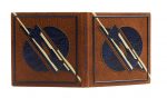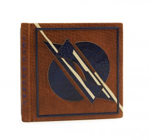 MARESTER (Guy) — Tête d’homme. — Nice, J. Matarasso, 1984. — In-32 carré (7,5 x 7,5 cm), oasis brun, sur les plats décor incrusté en relief de formes de peau bleu nuit avec bandelettes de maroquin ivoire mosaïquées, le tout pris dans un...