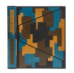 in-8 (28,2 x 21,2 cm), maroquin noir, décor géométrique sur deux niveaux avec pièces mosaïquées irrégulières de chagrin estampé bleu canard et de chagrin à grain fantaisie ocre et brun, dos lisse avec rappel du décor, auteur dans un compartiment de chagrin fantaisie ocre et artiste dans un autre de couleur brune, doublures de chagrin à grain fantaisie ocre avec cadre de maroquin noir et gardes de la même peau de couleur brune, tranches dorées, couvertures et dos conservés, chemise et étui (C. Honnelaître - 1990).