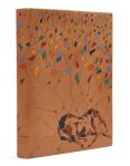 chagrin mosaïquées de différents modules, moutarde, orangé, rouge, bleu ciel, bleu marine, vert émeraude, vert sapin, reliées par des filets à l’œser brun, agrémenté en pied du premier plat, de pièces irrégulières de chagrin et de maroquin en camaïeu de brun figurant un taureau, dos lisse avec titre à l’œser brun en pied, tranches dorées, doublures avec encadrement de maroquin caramel et listel de maroquin marron et gardes de peau velours brune, couvertures et dos conservés, chemise, étui (M. Blin-1986).