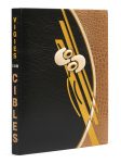 caramel estampée d’un grain imitant le reptile en gouttière, décor de bandes obliques de maroquin citron et d’incisions à fond jaune, sur le plat supérieur ce décor est complété d’une paire d’yeux stylisés en bois blanc bombé et buffle noir et maroquin citron, dos lisse avec titre à la chinoise de lettres mosaïquées de maroquin citron, crème et caramel, doublures et gardes de peau velours chamois, non rogné, couvertures et dos conservés (Alain Devauchelle – 1996).