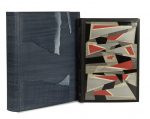GARCÍA LORCA (Federico). Romancero gitan. Paris, Marcel Lubineau, 1960. In-8 (27,7 x 19,3 cm), veau noir, sur les plats grand décor de marqueterie de bois gris, noir, rouge, blanc rayé de noir, et de métal brossé, le tout laqué et serti par un listel de veau noir, dos lisse orné du titre déstructuré en lettres ajourées à l’œser noir et au palladium, avec des pièces géométriques de box noir mosaïqué, doublures de bois laqué serti d’un listel de veau noir, gardes de peau velours gris éléphant, tête dorée, non rogné, couvertures et dos conservés, chemise et étui (Gauduchon-Blin – 1992).
