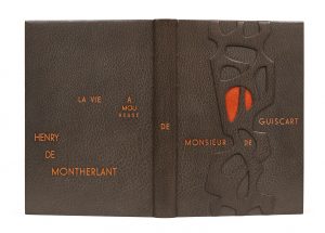 MONTHERLANT (Henry de) — La Vie amoureuse de Monsieur Guiscart. — Paris, les Presses de la Cité, 1946. — In-8 (27,8 x 18,8 cm), maroquin anthracite, sur le premier plat grande forme verticale en relief, ajourée et présentant des différences...