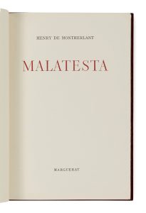 MONTHERLANT (Henry de) — Malatesta. — Lausanne, Marguerat, 1946. — In-12 (20,4 x 13,7 cm), reliure janséniste maroquin pourpre, dos à nerfs, doublures et gardes de peau velours cramoisi, couvertures et dos conservés, étui (P. L. Martin).