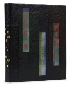 papier peint à l’aérographe de diverses couleurs sous plexiglas, nom de l’auteur estampé en lettres à froid au premier plat, dos lisse avec pièce de maroquin noir et titre doré, tranches dorées, couvertures et dos conservés, chemise et étui (D.-H. Mercher - 1995).