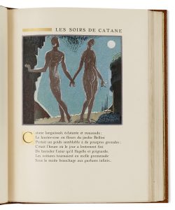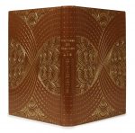 déployant sur un riche décor ondoyant fait de filets courbes et à froid complété par une multitude de points dorés de différentes tailles, dos lisse orné de petits filets droits dorés, titre doré à la chinoise entre des filets dorés et à froid, tête rognée, doublures de maroquin vert olive avec encadrement de spirales dorées et de triangles à froid, gardes de soie moirée havane, couvertures conservées, chemise, étui (G. Cretté, succ. de Marius Michel).