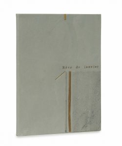 NOIRET (Gérard) — Rêve de janvier. — Paris, 1992. — In-12 (12 x 9,1 cm), reliure souple de veau gris partiellement teinté en bleu-gris, sur les plats décor de pièces de veau d’un gris un peu plus soutenu et jaune beurre, sur le premier...