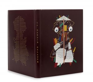 de papier holographique, complété par des filets dorés et au palladium, silhouette stylisée du même personnage au second plat, faite en filets dorés horizontaux, dos lisse avec titre doré à la chinoise, tête dorée, non rogné, doublures et gardes de peau velours taupe, couvertures et dos conservés, chemise et étui (M. Richard – 1991).