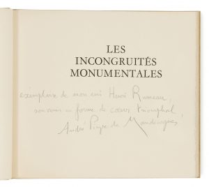 PIEYRE DE MANDIARGUE (André) — Les Incongruités monumentales. — Paris, Michel Cassé, 1967. — In-4 oblong (25, 2 x 27,2 cm), peau ivoire avec estampage imitant la peau d’autruche, au premier plat décor géométrique de pièces de bois...