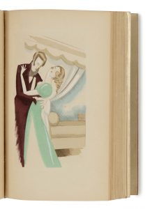 et vert sous-bois mosaïquées en tête et en pied des plats, agrémentées de jeux de filets dorés et à l’œser noir, se chevauchant parfois, dos lisse orné avec auteur, titre et artiste poussés or, tranches dorées, doublures bord à bord de veau crème, gardes de box émeraude, couvertures et dos conservés, chemise et étui (Alix).