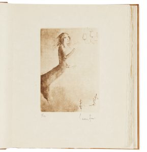 Tirage limité à 220 exemplaires, tous signés à la justification par Leonor Fini, l’un des 10 sur papier du Japon nacré (n° 2), comprenant une suite sur papier du Japon nacré également signée, un dessin original et un cuivre ayant servi à l’édition.