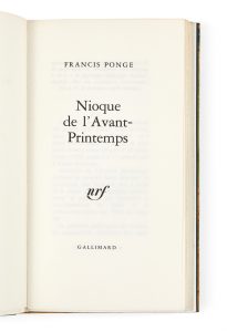 PONGE (Francis) — Nioque de l’avant-printemps. — Paris, Gallimard, 1983. — In-12 (20,8 x 10,9 cm), entièrement monté sur onglets, veau beige, orné d’un décor en impression digitale dans les tons jaune, vert, mauve et noir, titre...