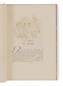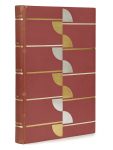 PROUST (Marcel) — Un Amour de Swann. — [Paris], NRF, [1930]. — In-4 (27, 5 x 18,4 cm), veau cerise, décor géométrique alternant quarts de sphère à l’or ou au palladium et bandes horizontales dorées ou de maroquin crème serti d’un...