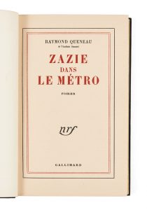 QUENEAU (Raymond) — Zazie dans le métro. — Paris, Gallimard, 1959. — In-12 (18,4 x 11,2 cm), maroquin noir, sur les plats, vaste décor de papier Kromekote à motifs noir, bleu et blanc, dans un filet d’encadrement doré, titre doré au dos,...