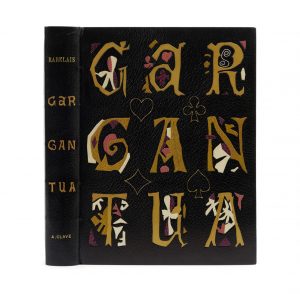 RABELAIS (François) — Gargantua. — S. l., les Bibliophiles de Provence, 1955. — In-4 (37,5 x 28 cm), maroquin noir, sur les plats décor constitué des lettres du titre mosaïquées de maroquin dans les tons ocres, agrémentées de fioritures...