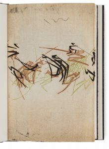 incrustation en gouttière d’un rectangle de cette peau intacte et vers le mors de petites pièces aux angles aigues teintées en ocre, vert et blanc, dos lisse muet, doublures de même peau poncée, gardes de peau velours chaudron, couvertures et dos conservés, boîte (F. Rousseau – Carlitos – 2003).
