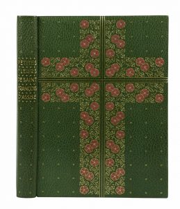 SAINT FRANCOIS D’ASSISE — Fioretti. Petites fleurs de Saint François d’Assise. — Paris, Jacques Beltrand, 1913. — In-4 (35,3 x 24,9 cm), maroquin vert sapin, au centre des plats grande croix formée de filets dorés et à froid, soulignés...