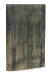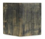 frottement sur certaines parties, moitié du premier plat et tiers du plat inférieur du même veau teinté découpé et incrusté, avec poursuite du décor au premier plat et rupture de celui-ci au plat inférieur, très petits losanges à l’œser rouge en tête et en pied des plats, minuscules pastilles mosaïquées de cuir rouge, dos lisse avec auteur, titre et artiste à l’œser orange, doublures bord à bord de veau teinté bleu-gris, gardes de peau velours bleu nuit couvertures rempliées et dos conservés, boîte (Sánchez-Álamo - mai 2005).