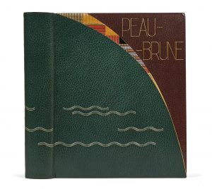 pièces de maroquin rouge, jaune, havane successivement décorées d’un jeu de filets or, puis d’un semis de billes or ou au palladium, dans la partie inférieure jeux de filets ondulés au palladium, titre de l’ouvrage en lettres dorées, dos lisse, doublure de maroquin rouge, double gardes de papier or, couvertures et dos conservés, tranches dorées sur témoins, chemise et étui gainés de maroquin vert (Marot-Rodde).