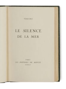 VERCORS [BRULLER (Jean, dit)] — Le Silence de la mer. — Paris, Éditions de minuit, le 20 février 1942. — In-12 (16,4 x 10,6 cm), reliure janséniste, maroquin vert, dos lisse, doublures de peau de vélin décorée avec encadrement de 6 filets...