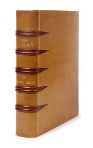 VIALAR (Paul) — La Grande meute. — Paris, Éditions Archat, 1945. — In-4 (37 x 27,5 cm), veau fauve, dos à doubles nerfs mosaïqués de chagrin feu se prolongeant en triangle sur les plats, doublures et gardes de peau velours chocolat,...