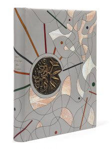 havane, noir, bleu nuit et vert mosaïqués, incorporant des pièces sur papier peint à l’acrylique avec projections de couleurs dans des tons pastels, minces bandes de maroquin de mêmes couleurs figurant les rayons du soleil et s’étendant sur le dos, au premier plat inclusion d’une large médaille en argent représentant un oiseau, dos lisse, tête dorée, encadrement intérieur de maroquin orangé, doublures et gardes de daim orangé, couvertures et dos conservés, chemise et étui (Gauduchon-Blin - 1994).