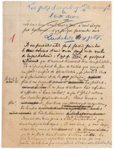 Vient ensuite le manuscrit fortement corrigé et annoté (crayon bleu, encre etc.), texte empreint de catholicisme dans lequel il revient sur les travaux des paléontologues et géologues. Il évoque ensuite avec poésie la découverte de ces grottes et les décrit. On trouve in fine un exemplaire du texte définitif extrait du recueil Variation dans un air français, publié au Mercure de France en 1942 (p 37 à 71).