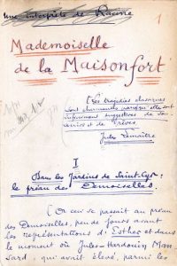 Intéressant manuscrit précédé d'une lettre adressée au comte René Philipon (1870-1936) dans laquelle il indique lui envoyer «...le manuscrit total de Mademoiselle de la Maisonfort (...)», ensuite 4 pages imprimées (faux titre, titre et épigraphe) avec des corrections à l'encre et des indications d'impression, dont une page portant le tampon «Plon-Nourri et Cie». Ce manuscrit est fortement corrigé, annoté. On trouve in fine les pages de notes explicatives collées sur des feuillets. Cet ouvrage de Edmond Pilon a pour théâtre les représentations d'Esther par les fillettes de Saint-Cyr et s'attache plus particulièrement, comme le titre l'indique, à Mademoiselle de Maisonfort.