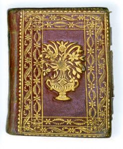 ALMANACH anacréontique, ou les ruses de l'amour. Paris, Boulanger, 1784. In-18, maroquin rouge, large bordure de deux roulettes de rubans dorés, grand vase fleuri au centre, dos orné, tranches dorées, passants (Reliure de l'époque).