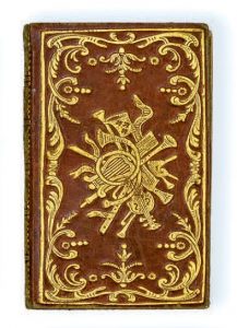 CALENDRIER de la cour (Le). Paris, J. Th. Hérissant, 1765. In-12, maroquin rouge, plaque dorée à encadrement de forme contournée, au centre grand trophée doré, dos orné, doublure et gardes de papier dominoté, tranches dorées (Reliure de l'époque).