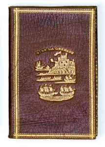 ÉTAT de la Marine. Paris, Imprimerie d'Houry, 1781. In-12, maroquin rouge, triple filet doré gras et pointillé, grande plaque centrale dorée avec fort et navires, dos fleurdelisé, doublure et gardes de papier dominoté doré, tranches dorées (Reliure de l'époque).