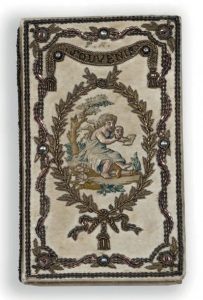 ÉTRENNES galantes des promenades et Amusemens de Paris et de ses environs. Paris, Boulanger, 1781. In-12, soie beige, encadrement de filets et pastilles de métal doré, au premier plat médaillon central portant une scène brodée de soies de couleurs : personnage tenant un masque et un message, surmonté d'une banderole avec la mention Souvenir, sur le second plat le médaillon porte un chiffre JMAC et la mention D'amitié, miroir intérieur (cassé) bordé d'un galon doré, dos orné, doublure et gardes de soie rose, tranches dorées (Reliure de l'époque).