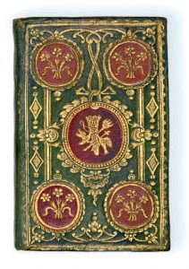 FEMMES ILLUSTRES (Les), étrennes et bouquet à présenter aux Dames en tous tems. Paris, Hardouin, 1781. In-12, maroquin vert, encadrement de filets et fers dorés avec médaillons de maroquin rouge orné d'un bouquet à chaque angle, au centre grand médaillon portant un trophée, dos orné, tranches dorées (Reliure de l'époque).
