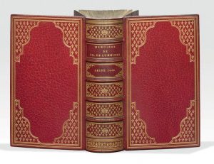 COMMINES (Philippe de). Les Mémoires. Dernière édition. Leyde, Elzevier, 1648. Petit in-12, maroquin rouge, encadrement orné de deux doubles filets dorés, écoinçons aux angles ornés d'un semé de fleur de lis, dos orné, caissons décorés aux petits fers et d'un semé de fleur de lis avec couronne répétée, dentelle intérieure, tranches dorées (Motte).