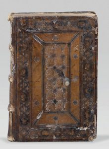 ÉRASME. Moriae encomium. Bâle, Froben, 1521. In-8, veau fauve, décor à froid d'un encadrement comprenant des portraits, un second encadrement vide ponctué de fers en forme de fleurs, au centre semé de bouquets, dos en partie peint en beige avec la cote R 60, tranches lisses (Reliure de l'époque).